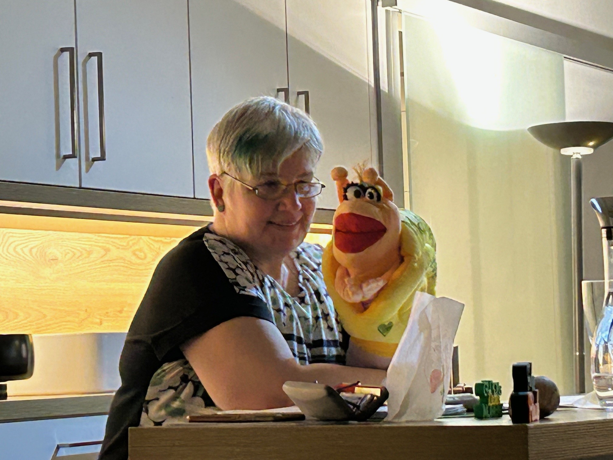 „GlücksMoment: Leben“ hieß unser Abend und mit einem bunten Mix aus Bewusstmachen, Bauchreden, Mini Lesung aus dem gemeinsamen Buch (von Malena und Birgit) und einer kleinen Klangreise mit zertifiziertem Heilinstrument umrahmt. Wir haben Mauli kennengelernt und die Glücksschnecke Helene, die mit ihrem „Glücks-Wohnmobil“-Schneckenhaus durch ihr Glücks-Leben streift. Von „Rosinen sind Trauben ohne Lebensfreude“ über kleine „mobile Glücksmomente“, von einer Meditation-Klangreise über das Gegenstück zum Glück namens „GLUCKSmoment bis zu einem Glücks-Gesang zusammen mit dem Publikum – dieser Abend war rundum „glücklich“ und vielseitig.