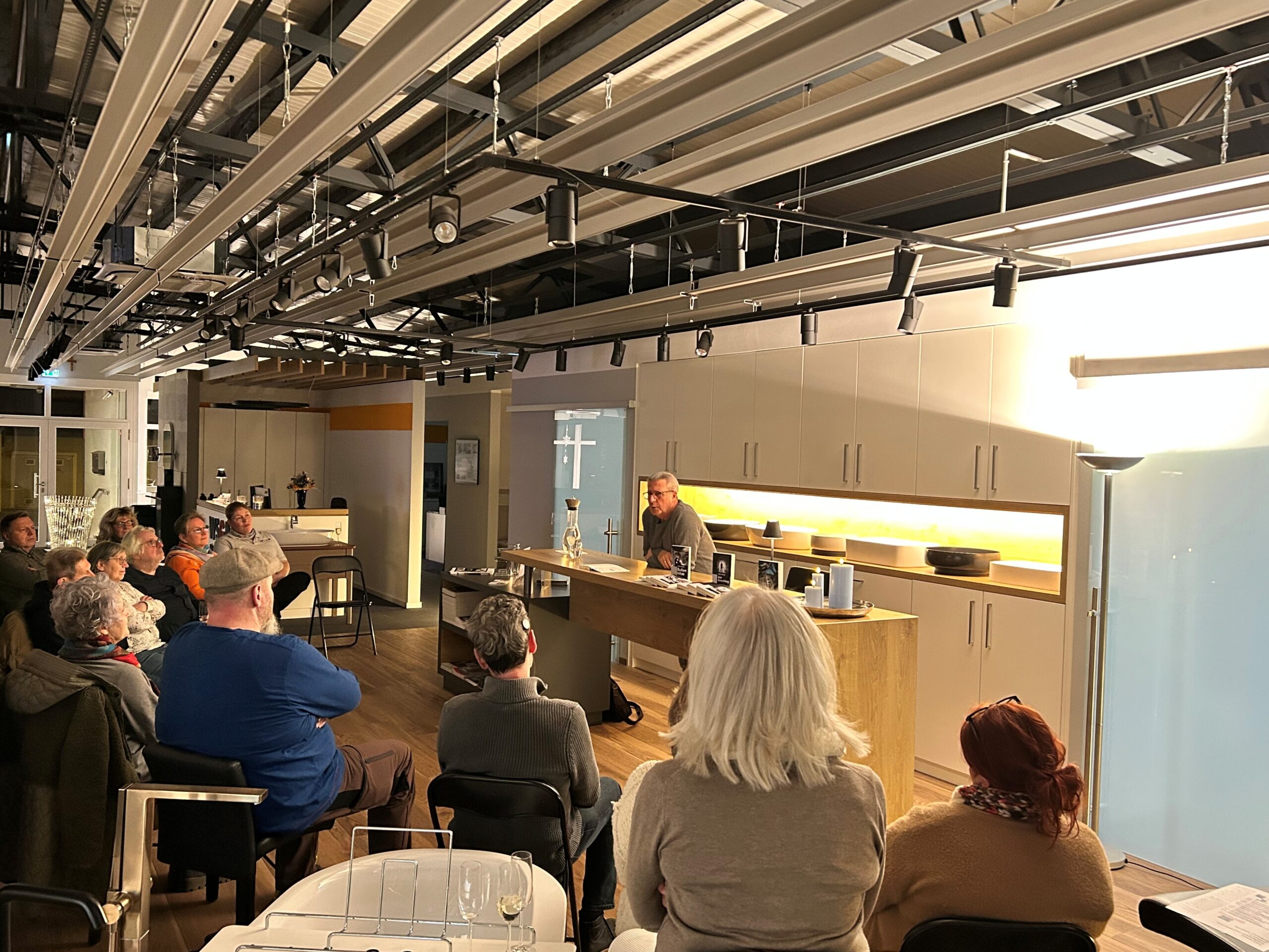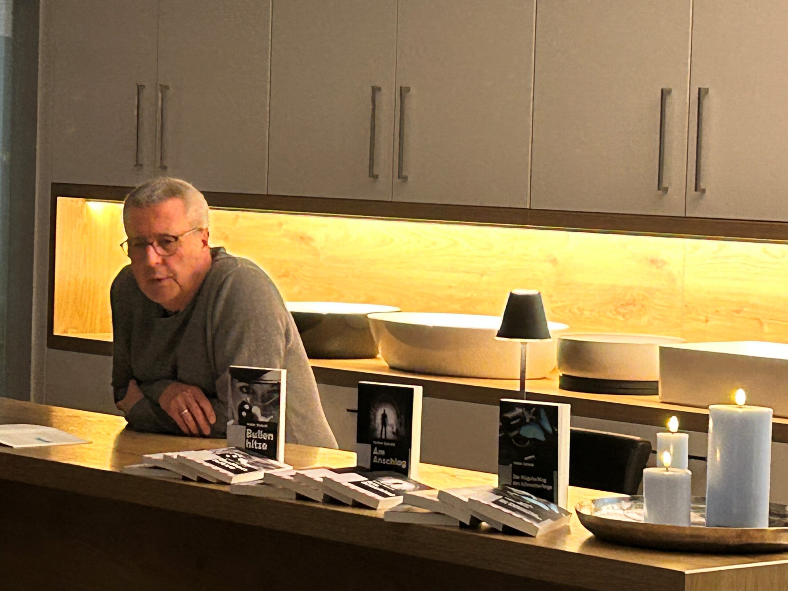 Natürlich konnte das Buch käuflich erworben werden, ebenso die zwei anderen Bücher, „Am Anschlag“, einem spannenden Politthriller, in dem sich die Wege eines Staatsschützers und eines Syrienrückkehrers kreuzen und „Bullenhitze“ – Hochspannung in der Hitze des ersten Würzburger „Jahrhundertsommers“. Volker hat alles herzlich signiert und alle Fragen drumrum beantwortet.
