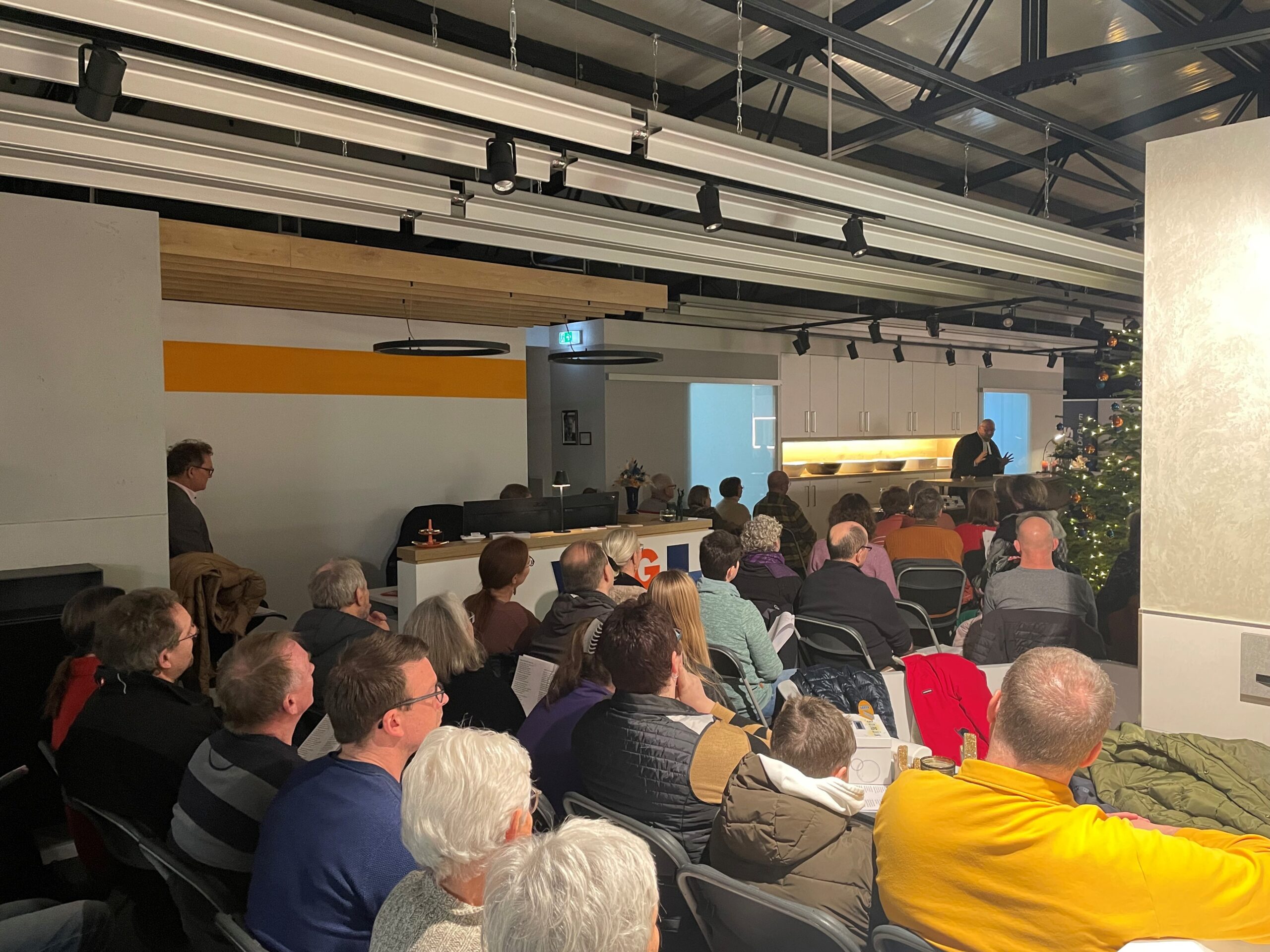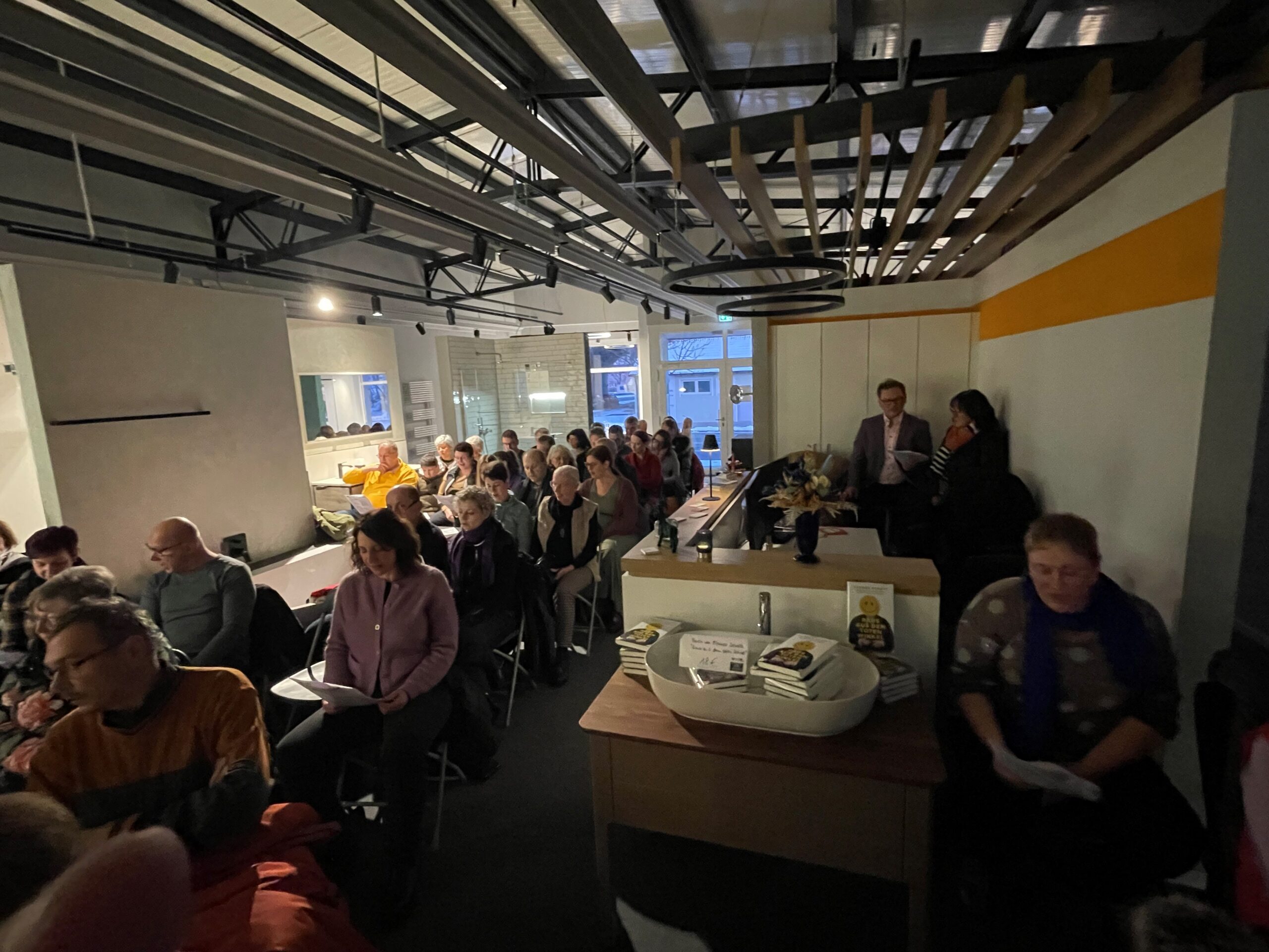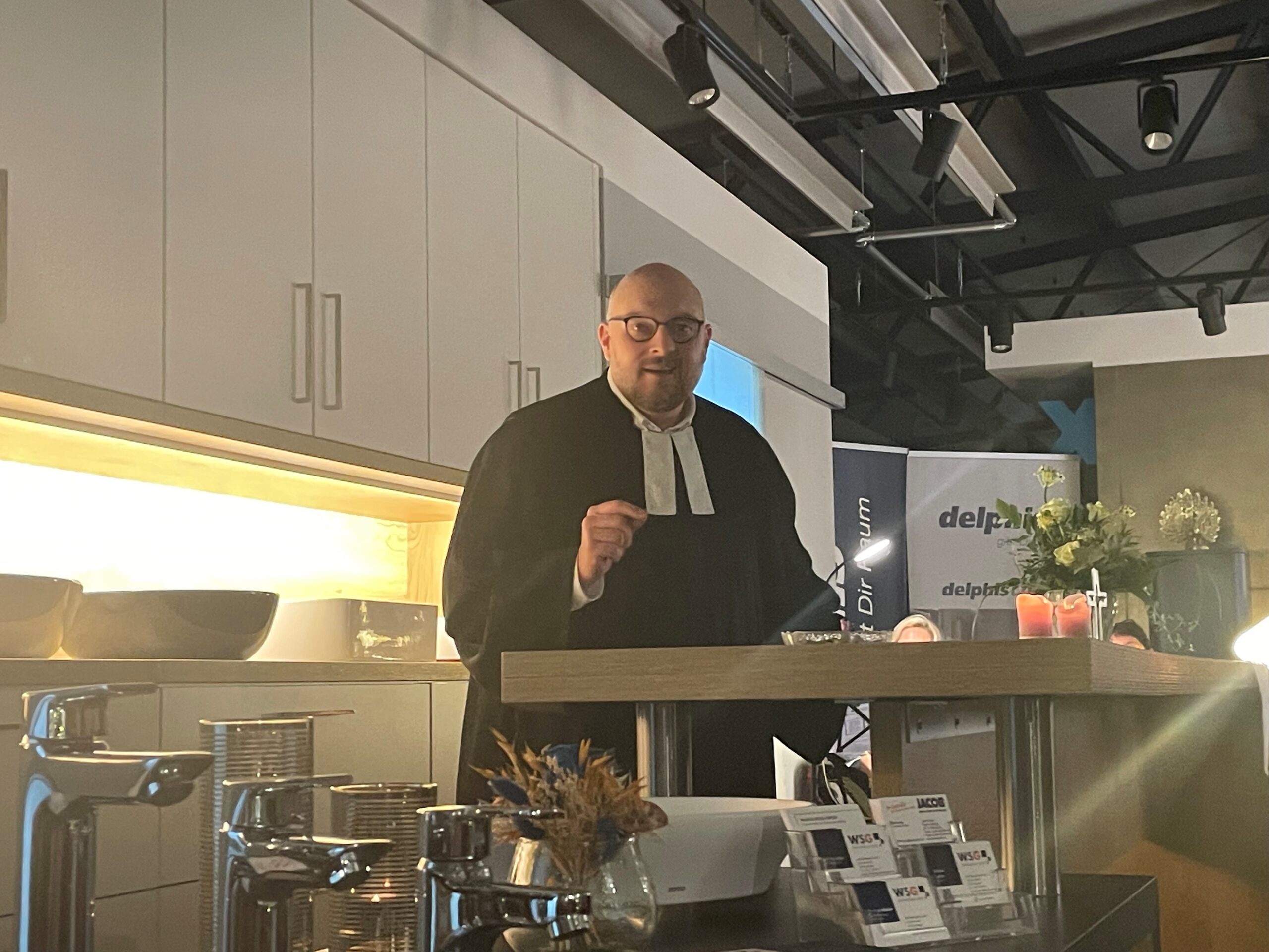 Mit dem Lied „Herr, wir bitten komm und segne uns“ und einem Segensgebet wurde die „BÄDERglück-Gemeinde“ eingestimmt, die Bibelworte der Seligpreisungen und der Hinweis auf Pfarrer Schotts Taufspruch aus Philipper 4 „Freuet euch in dem HERRN allewege! Und abermals sage ich: Freuet euch!“ haben den Weg für eine tolle Predigt (auf der nach seinen Worten längsten Kanzel der Welt) geebnet – „Freude und Humor“ als Christenmenschen auch im Gottesdienst, nicht nur, aber ein bißchen mehr davon würde er sich wünschen. Neben vielen Kirchen-Witzen und auch nachdenklich stimmenden Worten performte Pfarrer Schott seine umgedichteten Lieder: Aus „Aber bitte mit Sahne“ von Udo Jürgens wurde „Darauf bitte ein Amen“, Gottes Geschenke an die Menschen fanden sich im beliebten Lied „Halleluja“ von Leonhard Cohen und über Menschen, bei denen der liebe Gott einfach n bißle nachhelfen muß, damit mer sie mag sang er zur Melodie von „Weißt Du wieviel Sternlein stehen“. Der Spruch „Wenn ein Mensch nur Glauben hat, steht er in Gefahr, bigott zu werden. Hat er nur Humor, läuft er Gefahr, zynisch zu werden. Besitzt er aber Glaube und Humor, dann findet er das richtige Gleichgewicht, mit dem er das Leben bestehen kann.“ während der Predigt hat viele Menschen auch beim anschließenden Umtrunk noch bewegt und viele sind mit Pfarrer Schott ins Gespräch gekommen, auch weil sein Buch „Raus aus dem toten Winkel“ verkauft und von ihm signiert wurde.